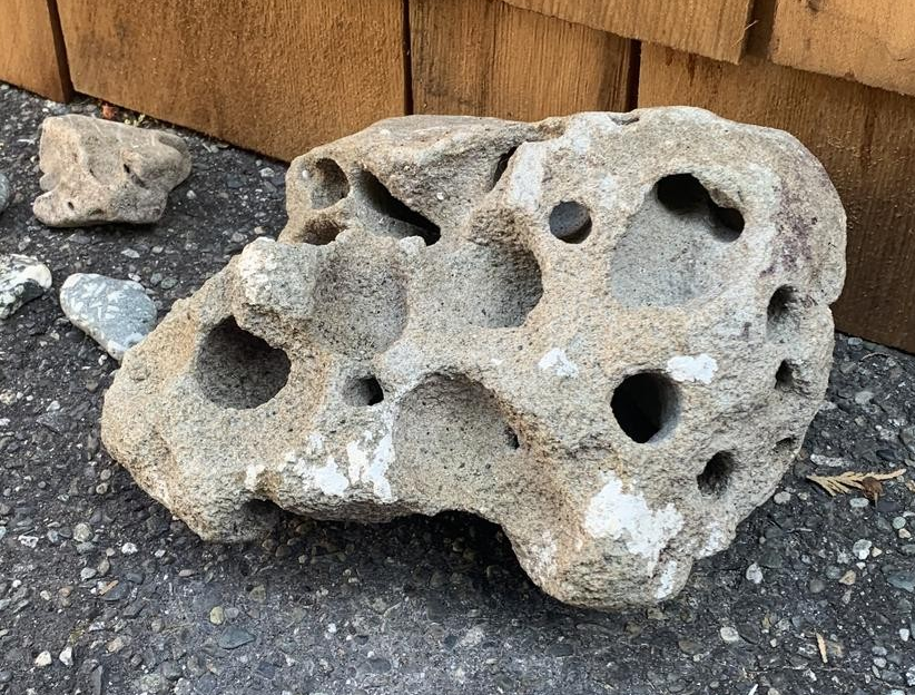 Unique sculptures combining driftwood and beach stones for a coastal vibe.